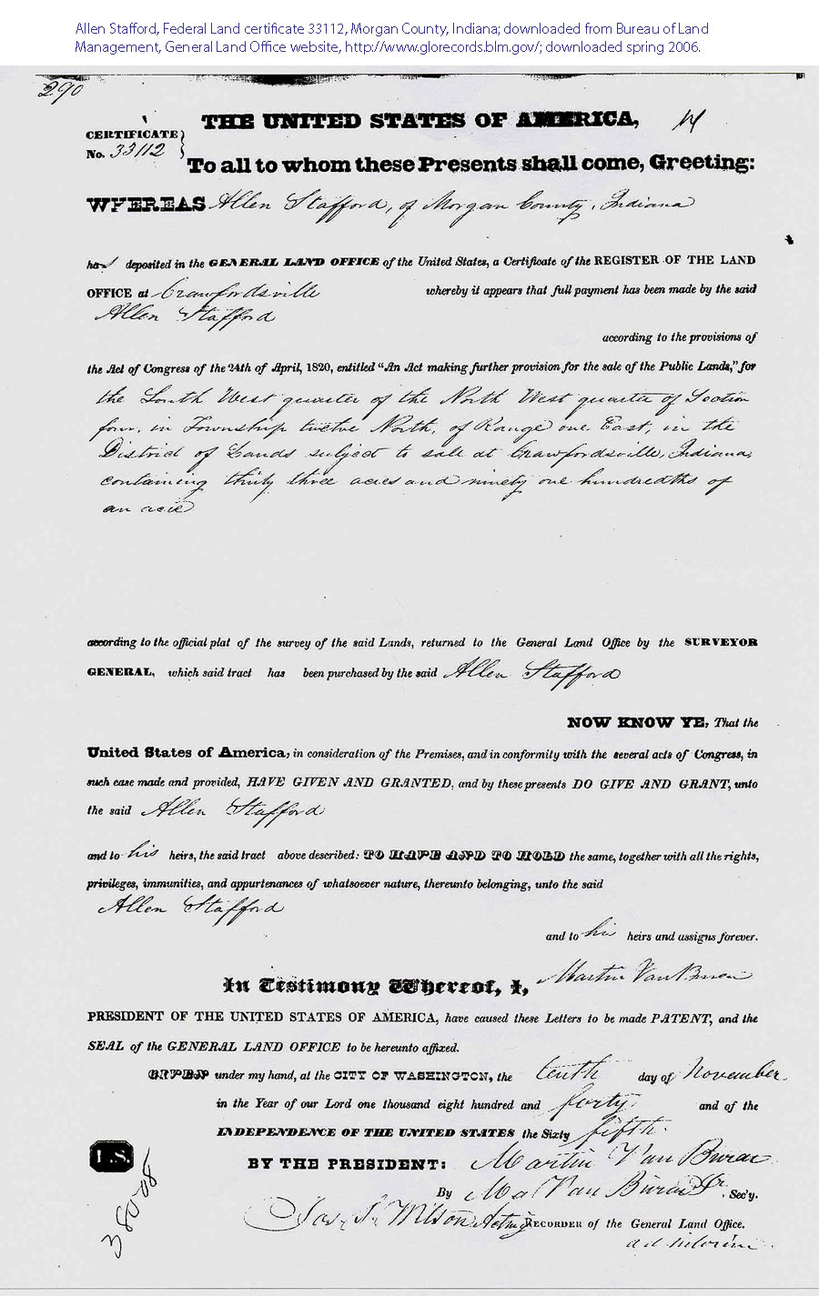 Stafford, Federal Land certificate 33112, Morgan County, Indiana;