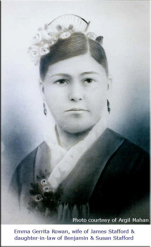 • Emma Gerrita Stafford nee Rowan, daughter in law of Benjamin and Susan Stafford; wife of their son, James Stafford.  Photos courtesy of Argil Mahan.