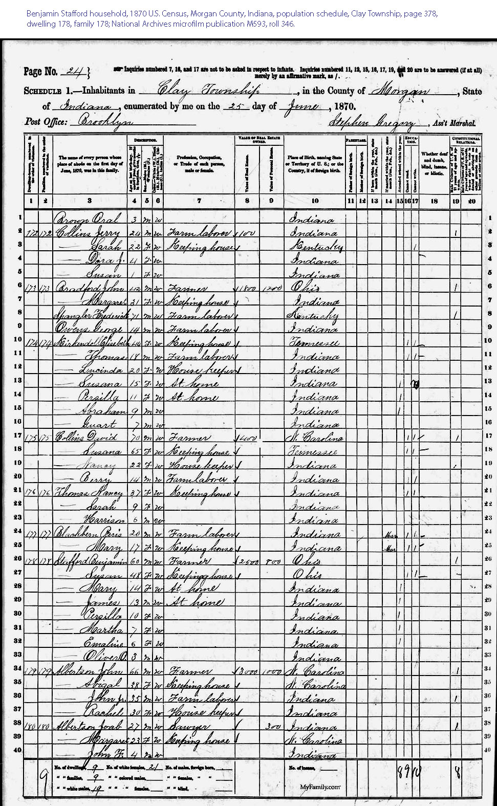 Stafford household, 1870 U.S. Census, Morgan County, Indiana,