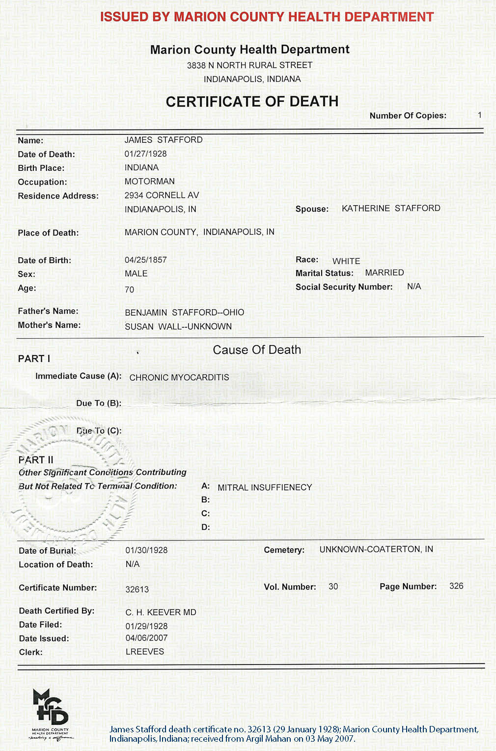 | 3 | James Stafford death certificate no. 32613 (29 January 1928), Marion County Health Department, Indianapolis, Indiana; received from Argil Mahan on 03 May 2007. |