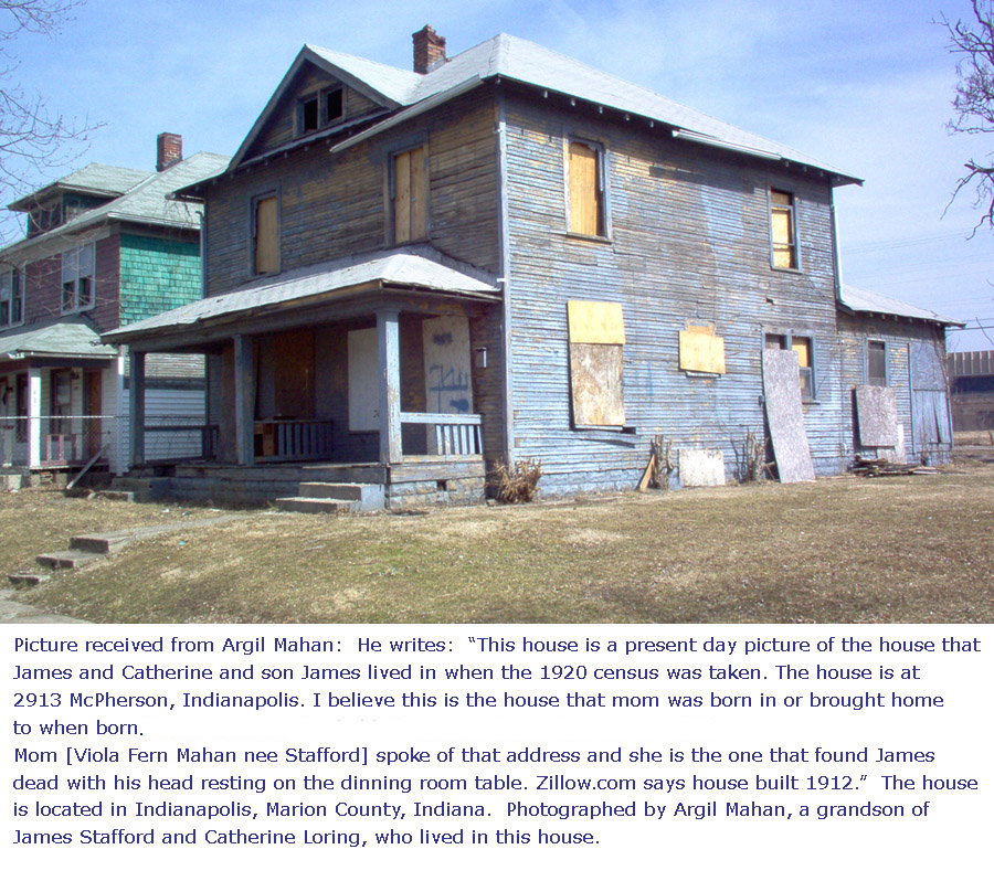 On 20 May 1914, he married his fourth, possibly fifth wife, Mrs. Catherine Winkler, in Marion County, Indiana.14,15 James had two more children with Catherine. They were James Jr.15 and Viola Fern Stafford. James and Catherine lived in Indianapolis at 2934 Cornell Avenue where James died on 273 or 28 January 1928.2