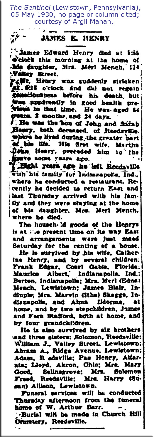 According to Argil Mahan, James and Catherine Henry decided to leave Indiana in 1930 and return to James' home in Reedsville, Pennsylvania.17 While he was in Indiana he owned a restaurant at 10th and Tuxedo just two blocks away from their home at 817 N. Oxford in Indianapolis. Catherine worked for James, which is probably how the met and decided to marry.17 James sold or lost the restaurant and decided to go back to Pennsylvania with Catherine, James Stafford Jr. and Viola Fern, he headed back to Pennsylvania in their "new" 1929 Ford in May of 1930. James Henry died very shortly after at his daughter's house in Pennsylvania.17 The date and place of his death was 5 May 1930 in Lewistown, Pennsylvania. [See Obituary of James Edward Henry.] The family tradition is that Catherine gave her sewing machine to the undertaker to pay for the funeral. James was buried in Church Hill Cemetery in Reedsville, Pennsylvania. Afterwards James' son Bert drove Catherine and children back to Indianapolis.