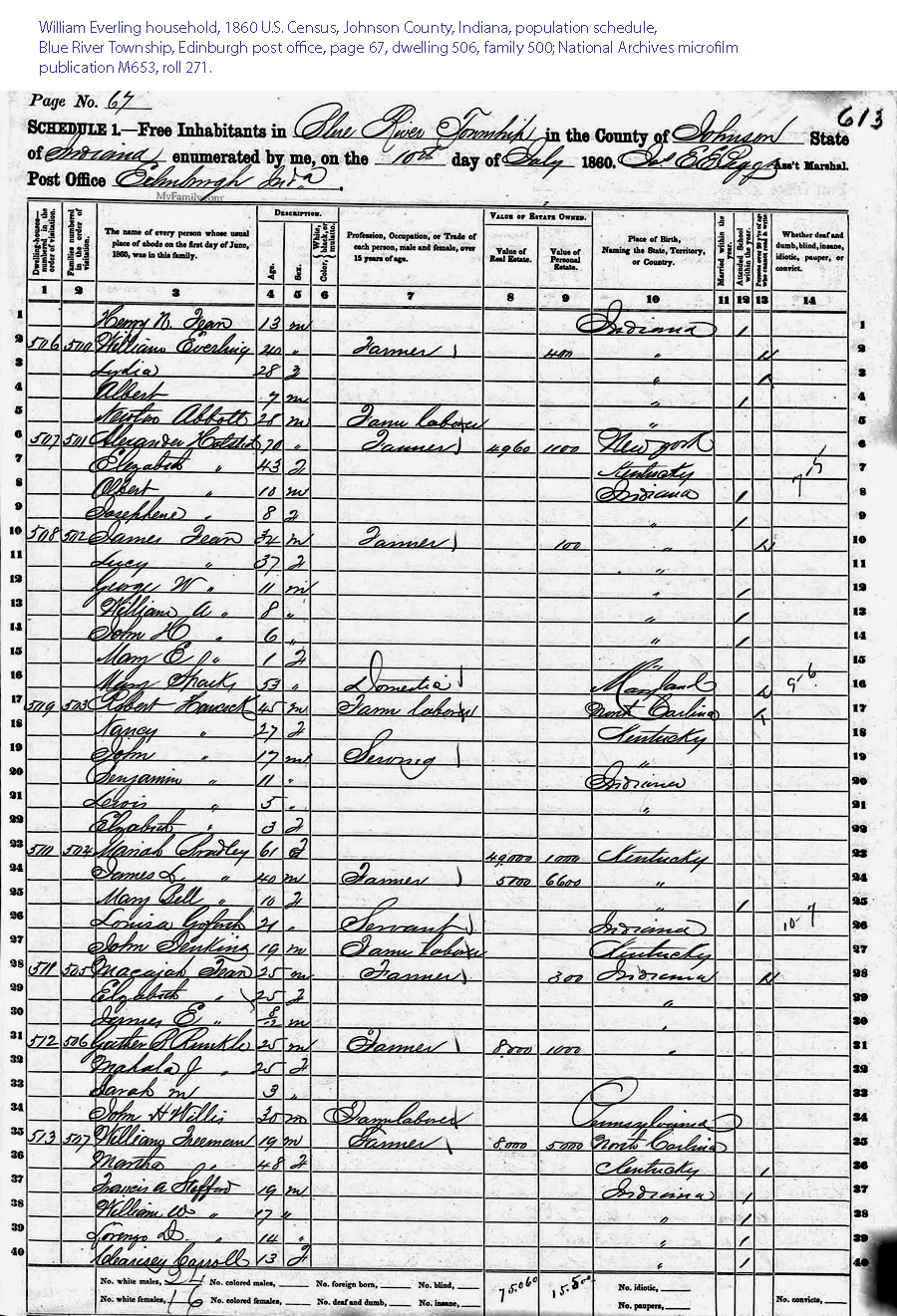 Everling household, 1860 U.S. Census, Johnson County, Indiana,