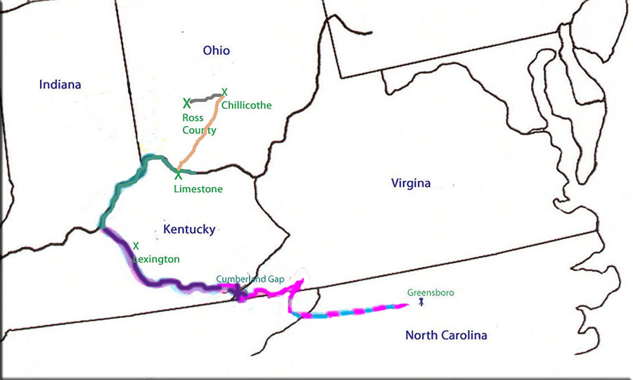 This road would have taken them from Guilford County, North Carolina to points west. They may have used Daniel Boone's Cumberland Gap to make their way through the rugged Cumberland Mountains and into Kentucky. Once they crossed into what is now Kentucky, they probably followed the Wilderness Road that was cut by Daniel Boone some 25-30 years before, northwesterly through Kentucky to the Ohio River. It was common at that time for people traveling to Ohio to use ferries to cross the Ohio River. It is possible that they took the Maysville Road northward until they reached the National Road and headed east where they ended up settling in what was then Ross County, Ohio.