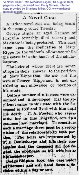Georg Rippe was born on 08 January 1826 and died 13 March 1899. He was buried at the Ohiowa Public Cemetery.